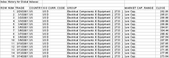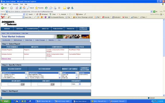 After choosing “Index Data, under “historical values” specify the appropriate criteria: country; sector; market cap range; currency; beginning and ending dates equivalent to the life of the option utilizing the most currently available date; and frequency.